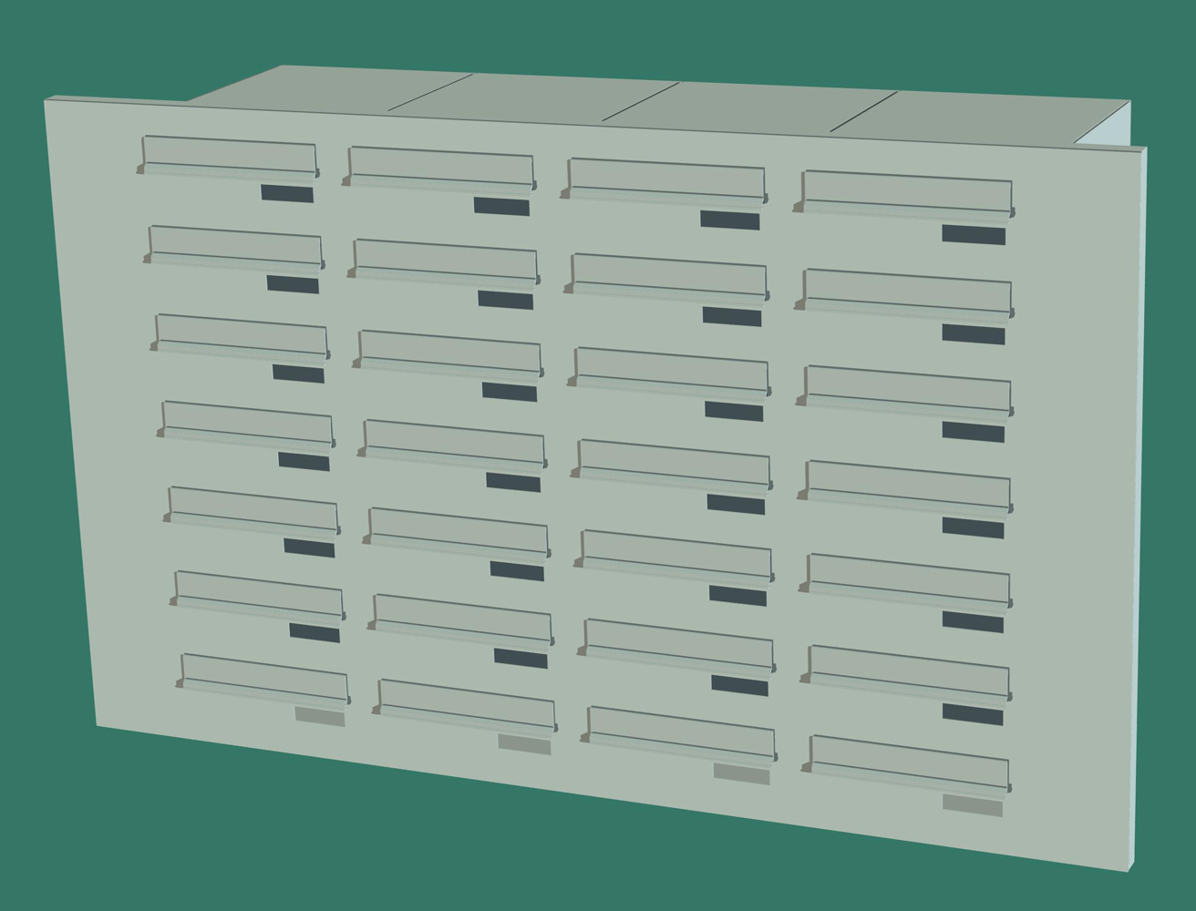 Rear-open SPO-28 postbox with twenty-eight letter slots (SPO standard)