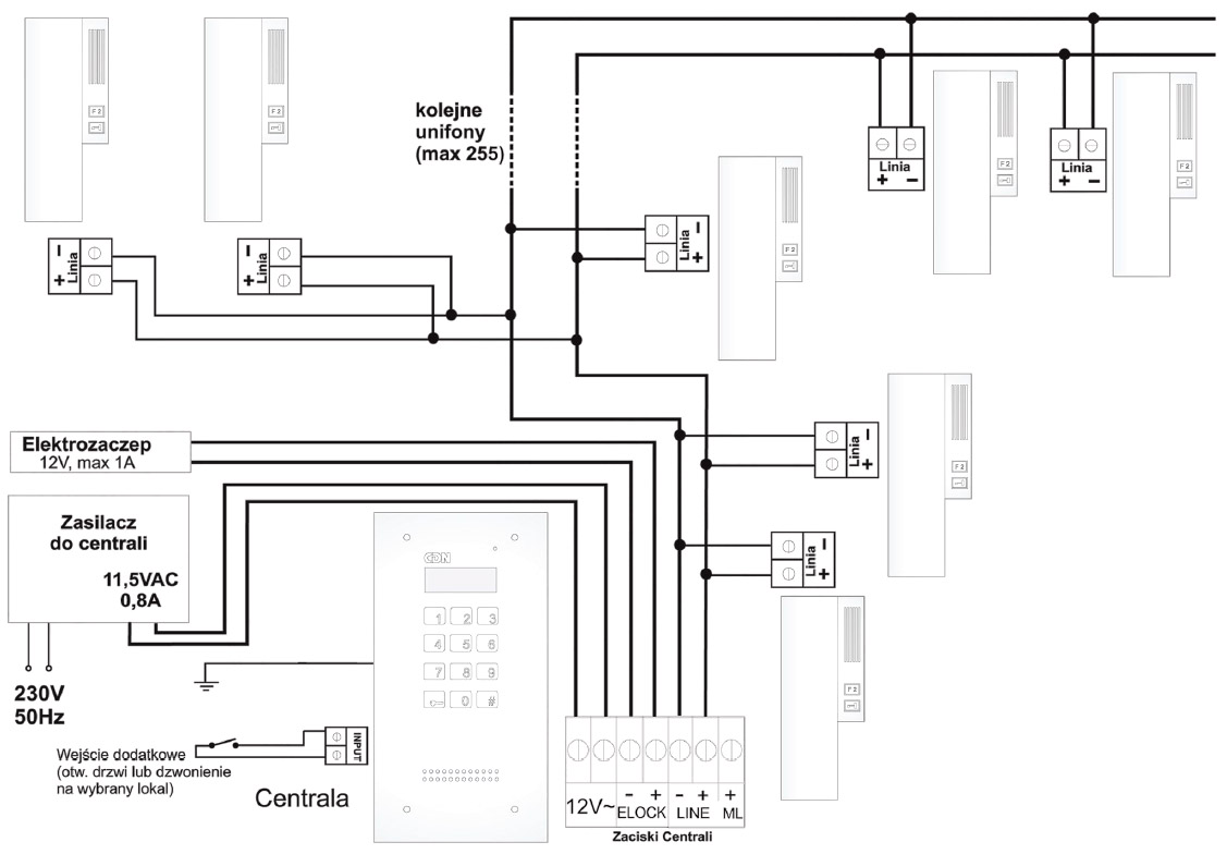 - Przy użyciu modułu CDNU - możliwość podłączenia w lokalu dodatkowego urządzenia sygnalizującego dzwonienie (dzwonka, sygnalizatora świetlnego)