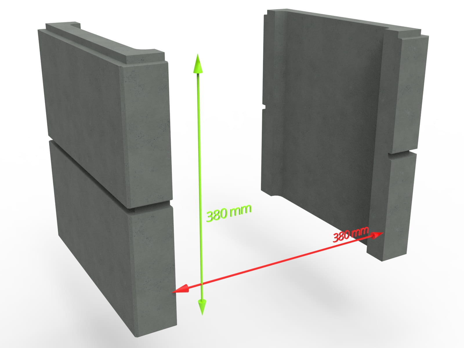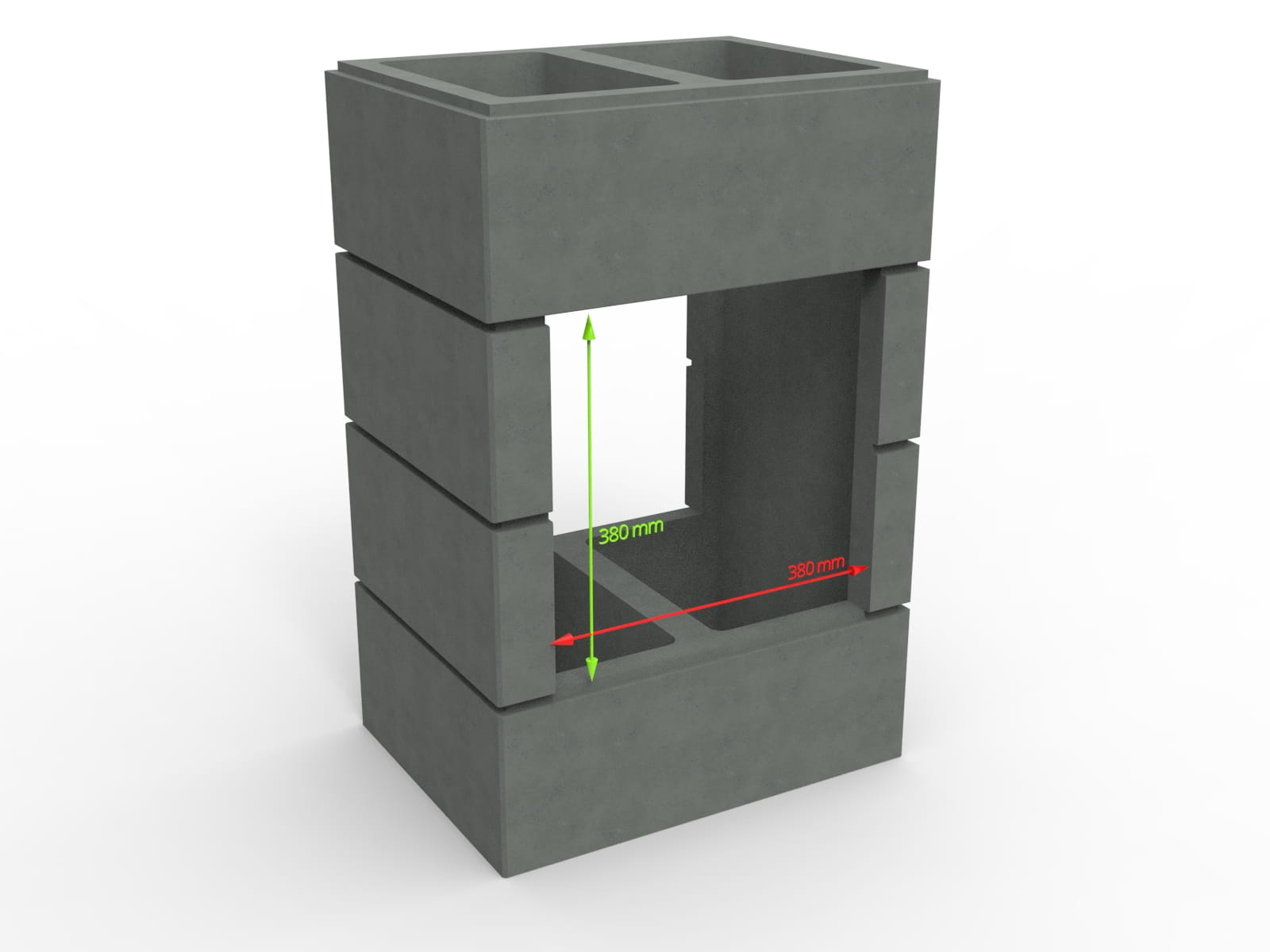 W celu osadzenia pojemnika w ogrodzeniu, w dwóch pustakach DREWBET CUBO K2 należy wykonać wycięcie całkowite 400 x 380 mm, pozostawiając 2 części bloczków po bokach, zgodnie z rysunkiem:
