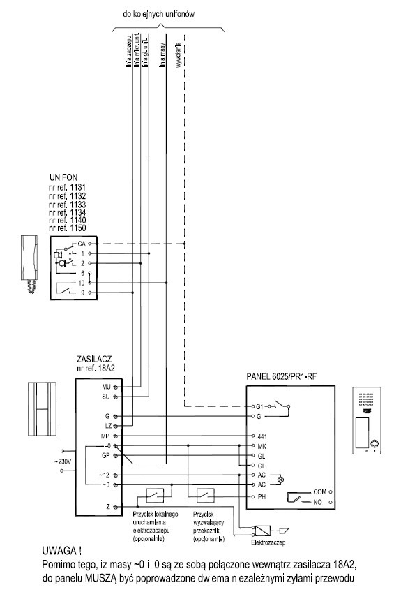 Do podłączenia zestawu wymagana jest instalacja 8-przewodowa. Panel zewnętrzny połączony jest ze wzmacniaczem domofonowym 8 żyłami, a wzmacniacz ze słuchawką - 5 żyłami (patrz: schemat). Otwieranie dodatkowej bramy automatycznej wymaga dodatkowych 2 przewodów.