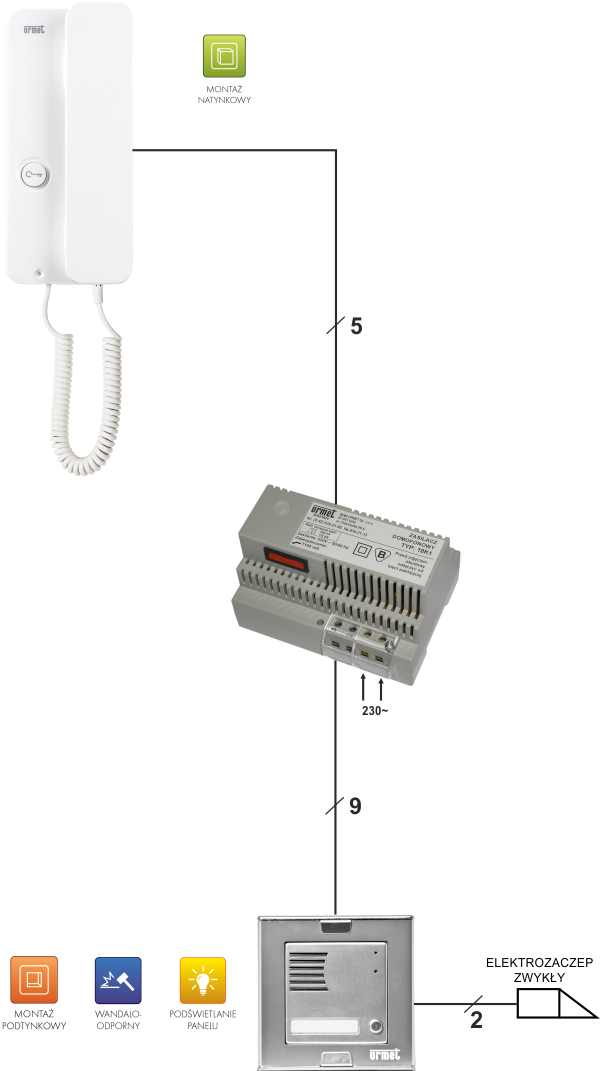 Do podłączenia zestawu wymagana jest instalacja 9-przewodowa. Panel zewnętrzny połączony jest ze wzmacniaczem domofonowym 9 żyłami, a wzmacniacz ze słuchawką - 5 żyłami (patrz: schemat).