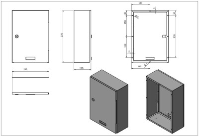 Szerokość 280 mm, wysokość 370 mm, głębokość 120 mm.