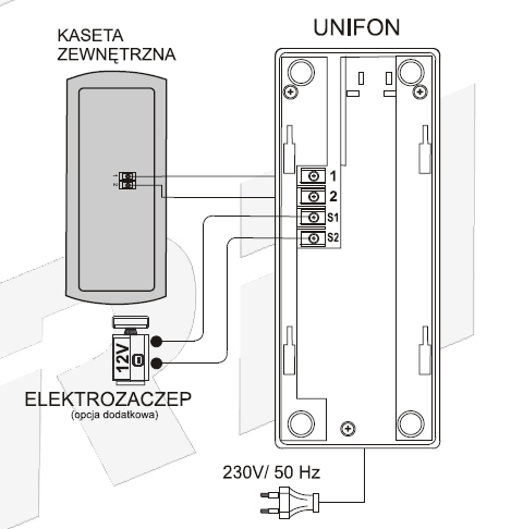 Wymagana jest instalacja 4-przewodowa (2 przewody łączące unifon ze stacją bramową + 2 przewody łączące unifon z elektrozaczepem). Elektrozaczep nie wymaga dodatkowego zasilania, konieczne jest jednak zastosowanie elektrozaczepu na prąd stały 12VDC.