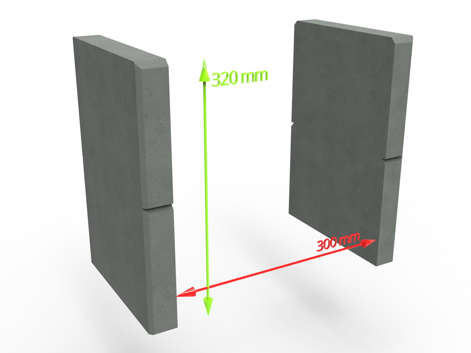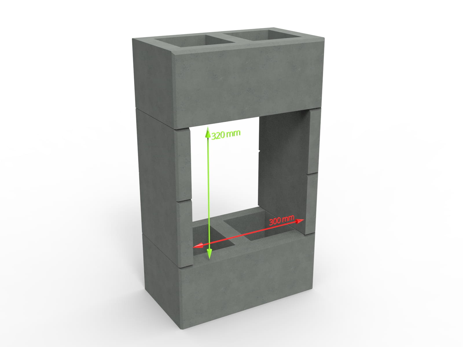 W celu osadzenia pojemnika w ogrodzeniu, w dwóch pustakach DREWBET CUBO MINI KM1 należy wykonać wycięcie całkowite 300 x 320 mm, pozostawiając 2 części bloczków po bokach.