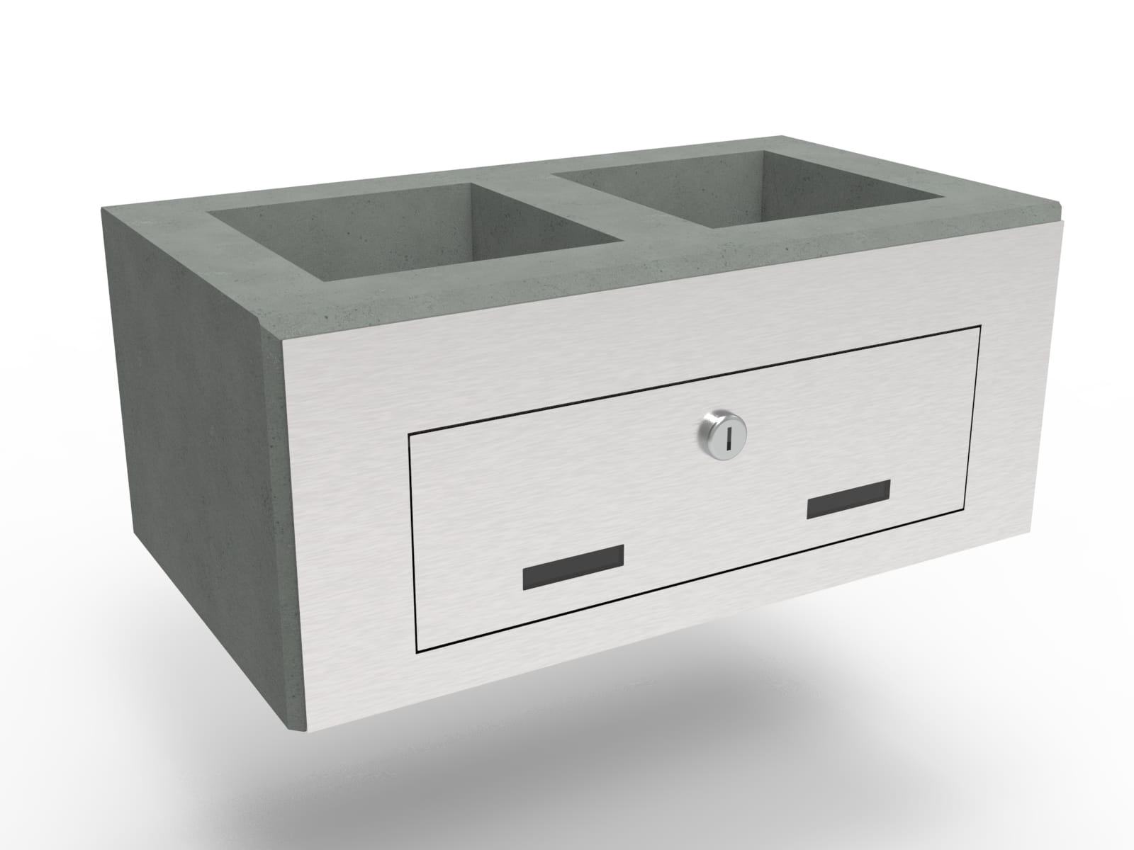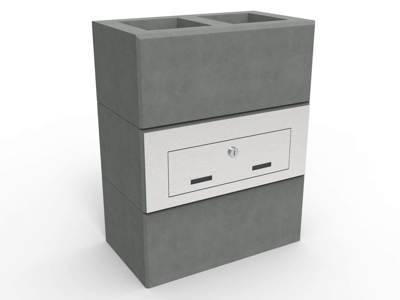 Skrzynka ma budowę panelową, składają się na nią: panel przedni, panel tylny i szuflada (pojemnik do osadzenia w bloczku).