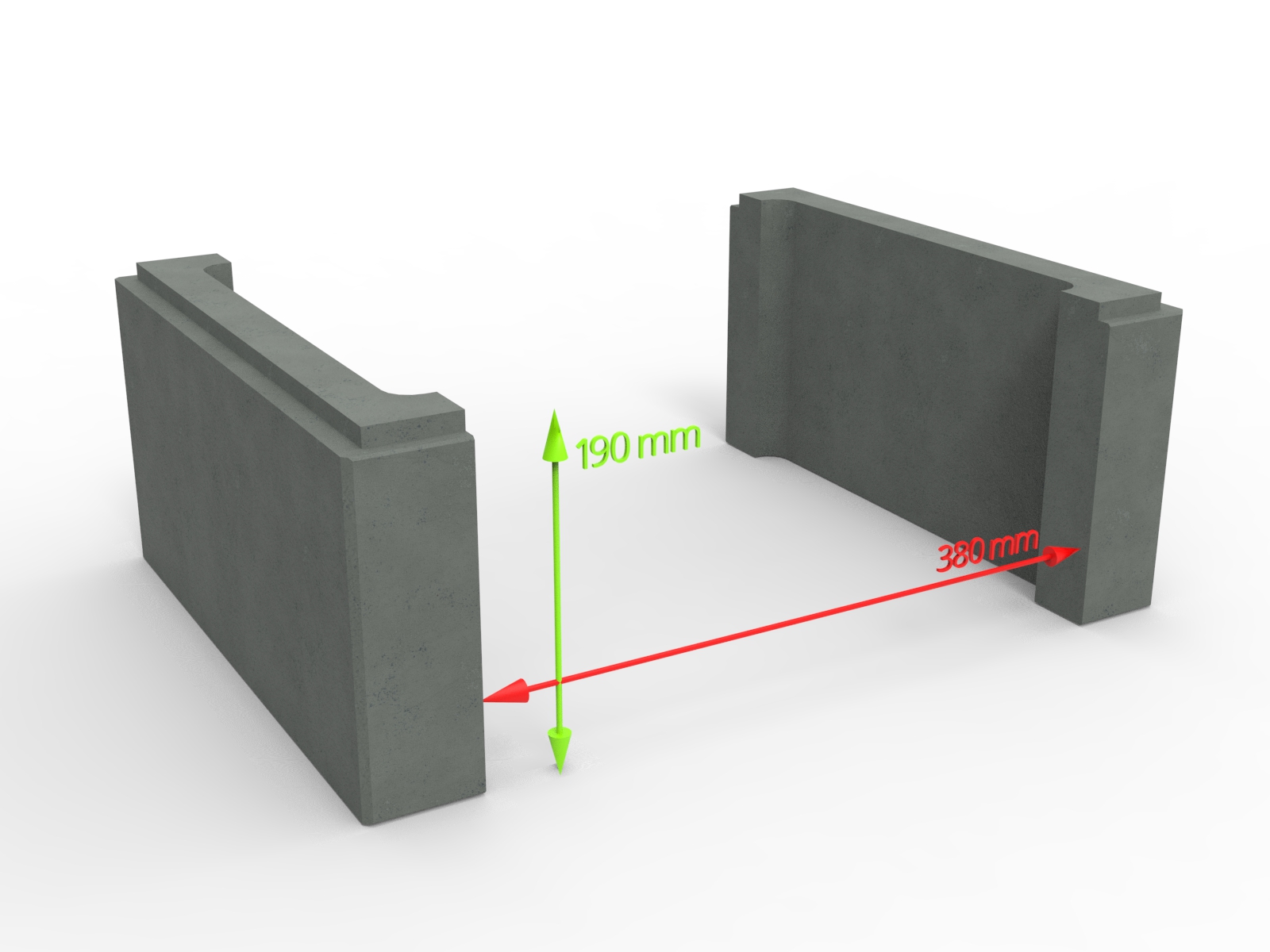 W celu osadzenia pojemnika w ogrodzeniu, w pustaku DREWBET CUBO K2 należy wykonać wycięcie typu C, całkowite 380 x 190 mm, pozostawiając 2 części bloczka po bokach, zgodnie z rysunkiem: