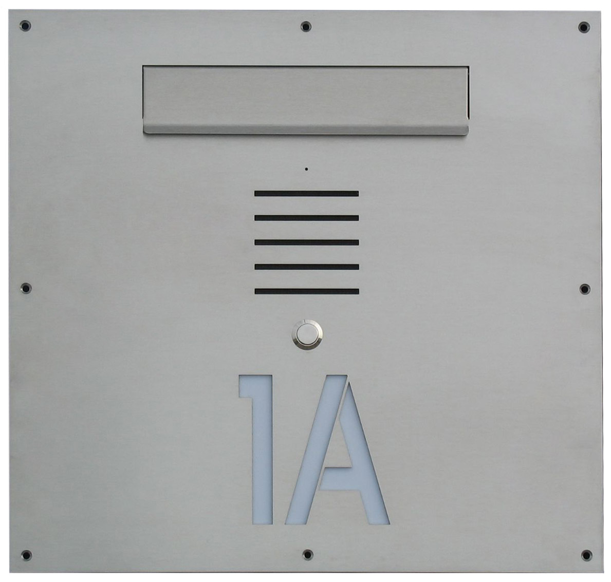 Z jednym wrzutem i jednym przyciskiem domofonu. W panelu przednim wycięty i podświetlony napis.