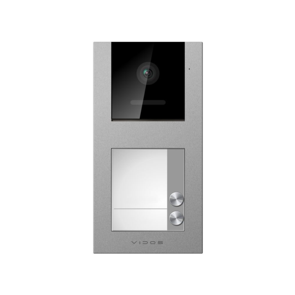 Natynkowy panel zewnętrzny wideodomofonu Vidos X z kamerą, 2 przyciskami wywołania i czytnikiem breloków zbliżeniowych RFID.