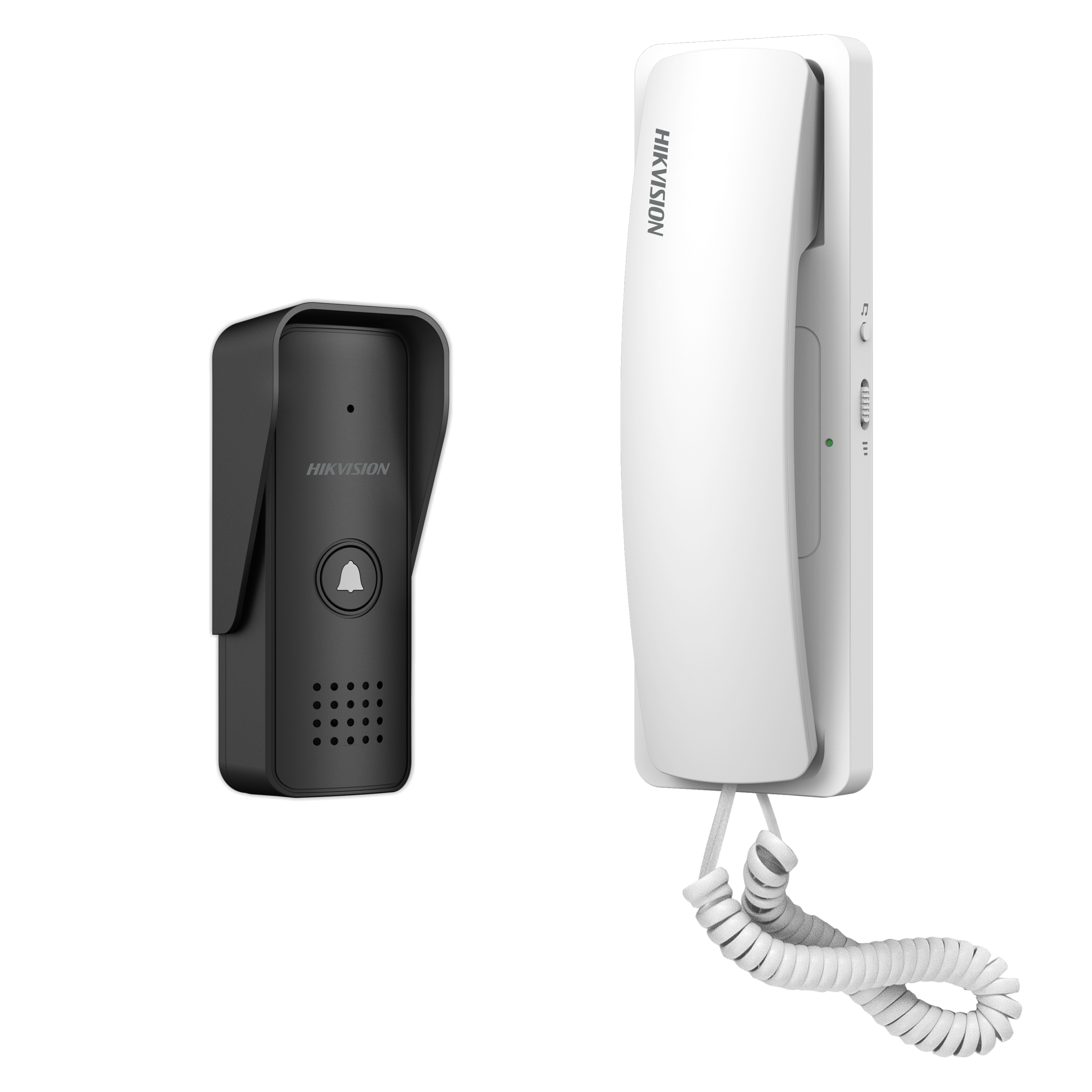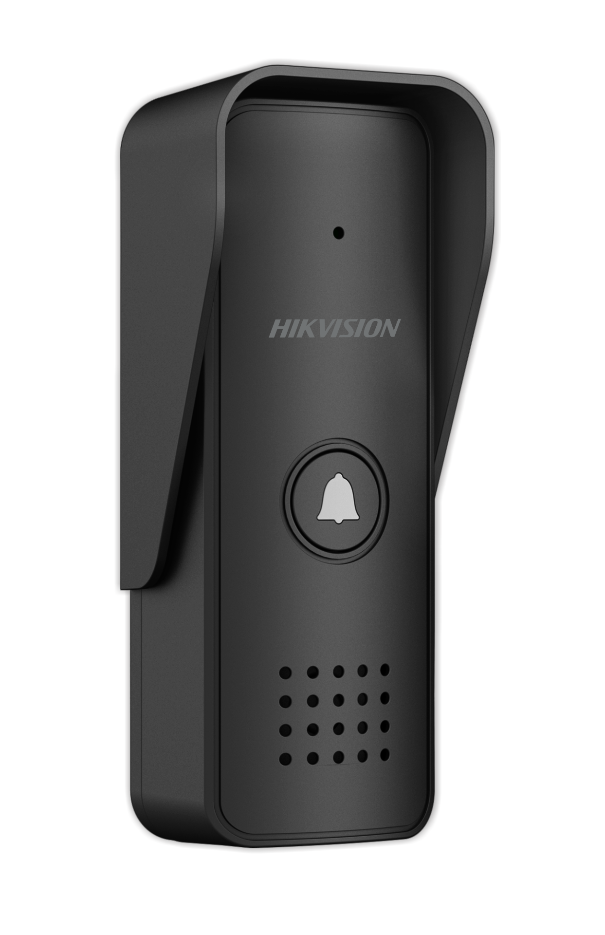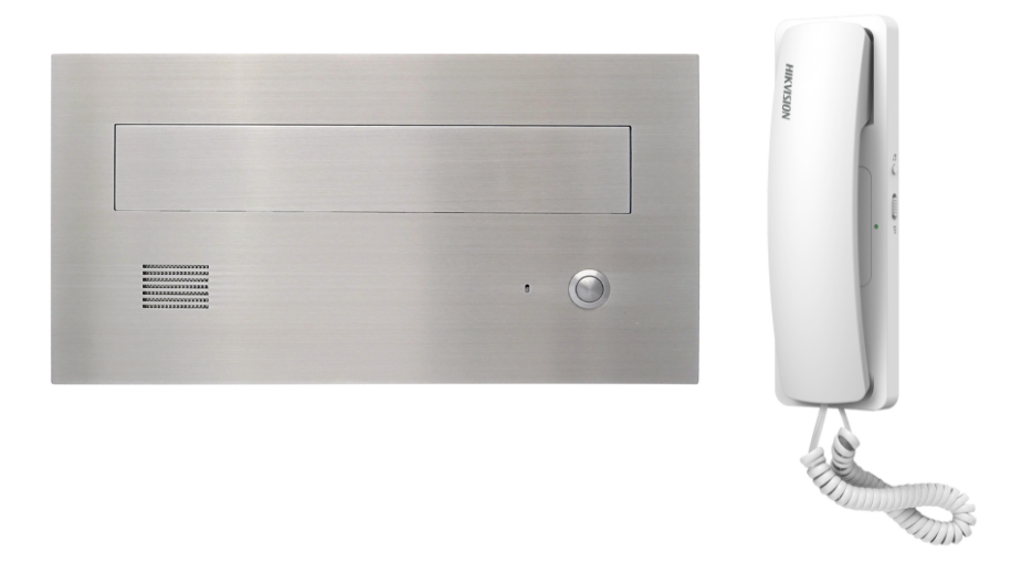 W panelu frontowym wbudowany jest jeden przycisk dzwonienia oraz analogowy moduł domofonu z mikrofonem i głośnikiem, które razem zastępują tradycyjny panel wywoławczy (panel zewnętrzny) domofonu. Na potrzeby zestawu są połączone z panelem z zestawu Hikvision KIS103.