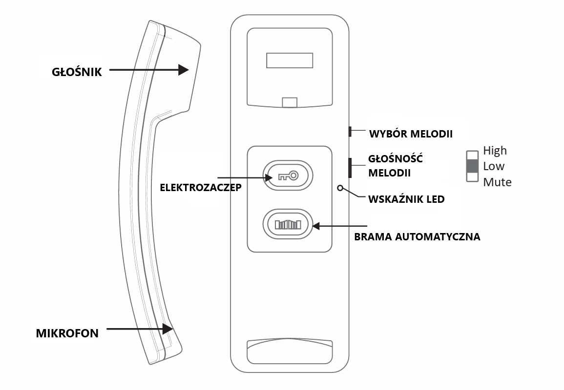 Unifon w zestawie dostępny jest w białej błyszczącej obudowie. Wyposażony jest w przycisk otwierania elektrozaczepu oraz drugi przycisk umożliwiający otwieranie bramy automatycznej. Unifon zasilany jest bezpośrednio z sieci 230V (posiada przewód zasilający z wtyczką).