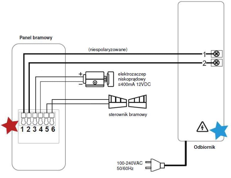 Analogowa instalacja domofonowa do powyższego zestawu wymaga okablowania 2-żyłowego.