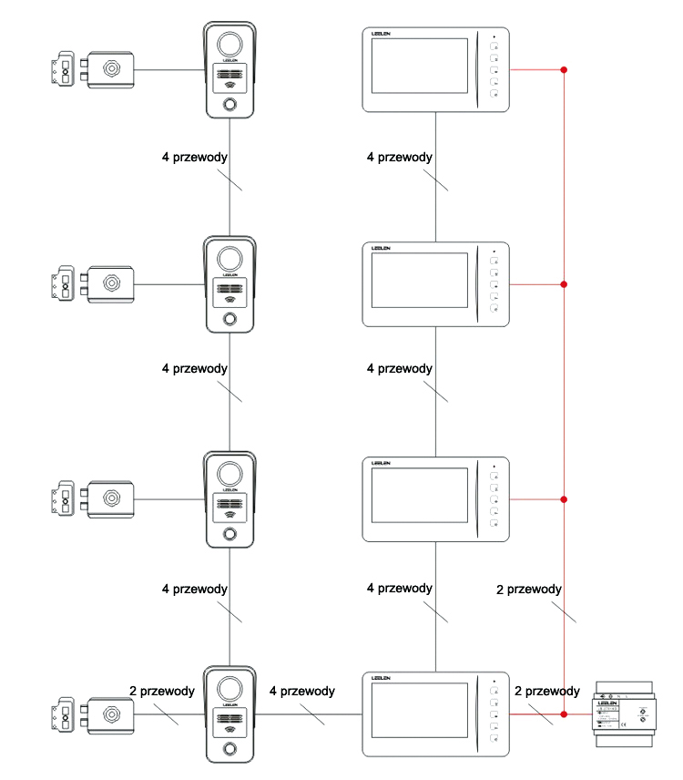 - połączenia: 4 przewody pomiędzy monitorem i panelem zewnętrznym